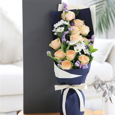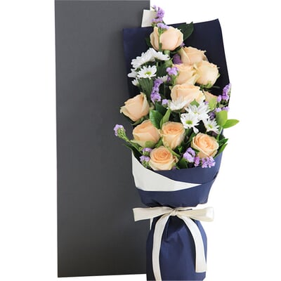 花 材香檳玫瑰11枝、白色小雛菊3枝、淺紫色勿忘我4枝、梔子葉2枝,禮盒款