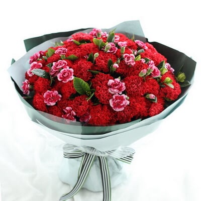 花 材紅色康乃馨66枝,搭配白邊紫色多頭康乃馨15枝,梔子葉2扎