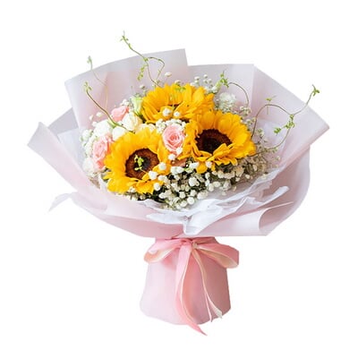 3朵向日葵、9朵粉佳人玫瑰花束