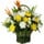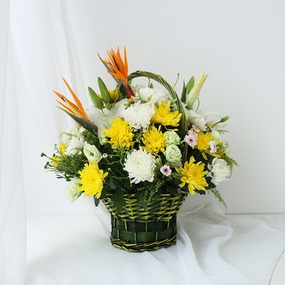 白菊11枝,黃菊11枝,白百合2枝,手提花籃