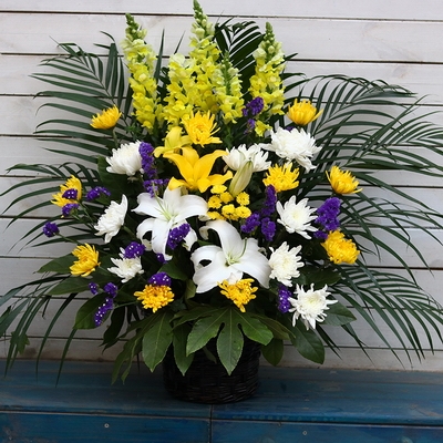 黃菊10枝,白菊8枝,白百合2枝,花籃插花