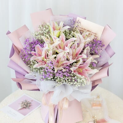 花 材6枝多頭粉百合,紫色、白色滿天星外圍