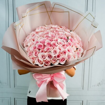 包 裝透明霧面紙內(nèi)襯,粉色霧面紙多角包裝,精美緞帶花結(jié)