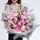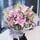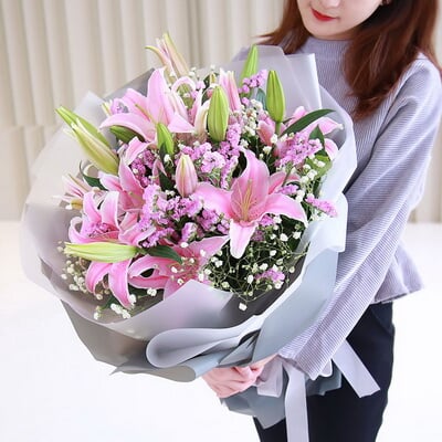 花 材5支多頭粉百合,搭配適量的滿天星、粉勿忘我等