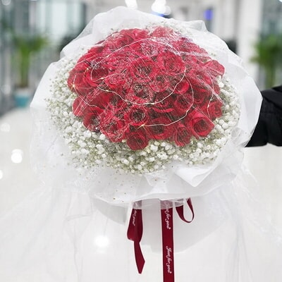 花 材51支紅玫瑰,led燈一條,搭配適量的滿天星外圍