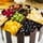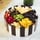 圓形巧克力蛋糕,蛋糕表面是適量水果用巧克力片隔開,側(cè)面是黑色巧克力片外圍