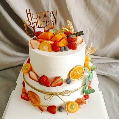 8寸+12寸雙層蛋糕。新鮮制作蛋糕胚,時(shí)令水果夾心+精選奶油疊加,表層時(shí)令水果,檸檬片,HappyBirthday插件等裝飾