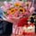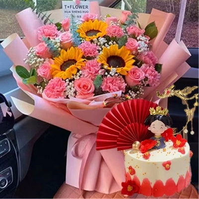 10支粉康,9支粉玫瑰,3支向日葵,白色滿天星間插,尤加利葉、梔子葉搭配;圓形水果蛋糕,現(xiàn)烤蛋糕胚,新鮮水果夾心,優(yōu)質(zhì)奶油疊加,表層中國(guó)風(fēng)主題配件裝飾