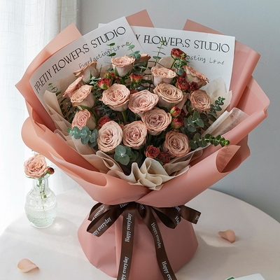 包 裝米黃色雪梨紙+英文包裝紙內(nèi)襯,淺棕色霧面紙多層韓式包裝,棕色蝴蝶結(jié)束扎