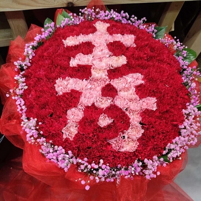 花 材99支混搭康乃馨(紅+粉),擺“壽”字造型,粉色滿天星外圍