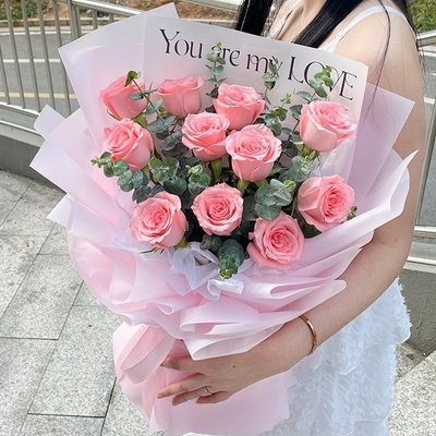 包 裝白色綿紙打底,粉色珠光紙多層多角包裝,精美緞帶蝴蝶結(jié)束扎