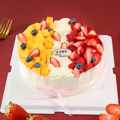 內(nèi)層新鮮蛋糕胚,新鮮水果夾心,表層芒果,草莓,奶油裝飾,側(cè)邊粉色絲帶裝飾精美