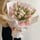 包 裝粉色雪梨紙打底,淺粉色霧面紙多層單面包裝,粉色緞帶蝴蝶結(jié)束扎