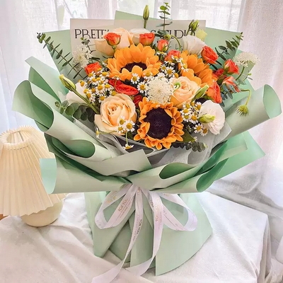 花 材6支香檳玫瑰,1支向日葵,洋甘菊、尤加利葉搭配