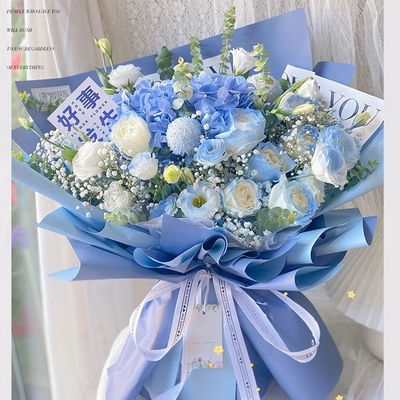 包 裝白色英文包裝紙內(nèi)襯,藍色霧面紙韓式單面花束,精美絲帶