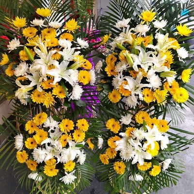 花 材黃菊,白菊,白百合,散尾葵悼念花籃