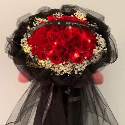 花 材33枝紅玫瑰,滿天星外圍豐滿,彩燈搭配