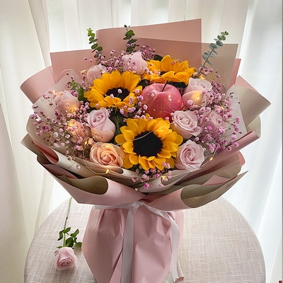 花 材11枝粉玫瑰,3枝向日葵,1個蘋果,1條彩燈,粉色滿天星、尤加利葉間插
