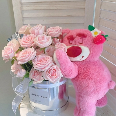 花 材33枝粉佳人玫瑰,1個草莓趴趴熊