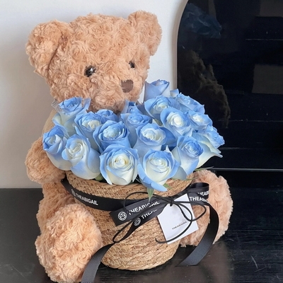 花 材19枝碎冰藍玫瑰,1個30cm左右高小熊公仔