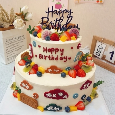 6寸+12寸雙層水果蛋糕。新鮮水果夾心,表層時令水果,奶油手繪祝福,餅干等裝飾