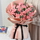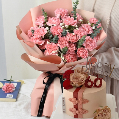 圓形鮮奶蛋糕,新鮮水果夾心,表層3朵卡布奇諾玫瑰,2朵紅玫瑰,數(shù)字蠟燭,中國(guó)風(fēng)盤扣等搭配;19支粉色康乃馨,白色滿天星、尤加利葉間插